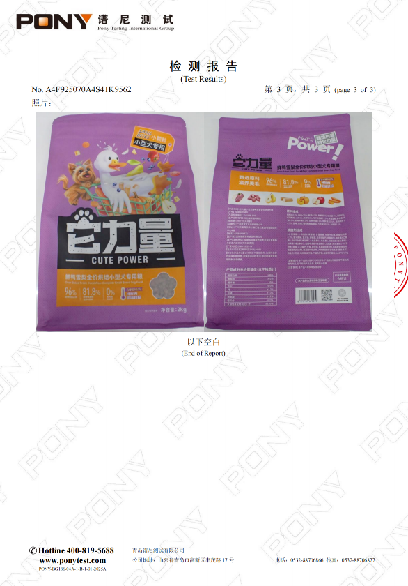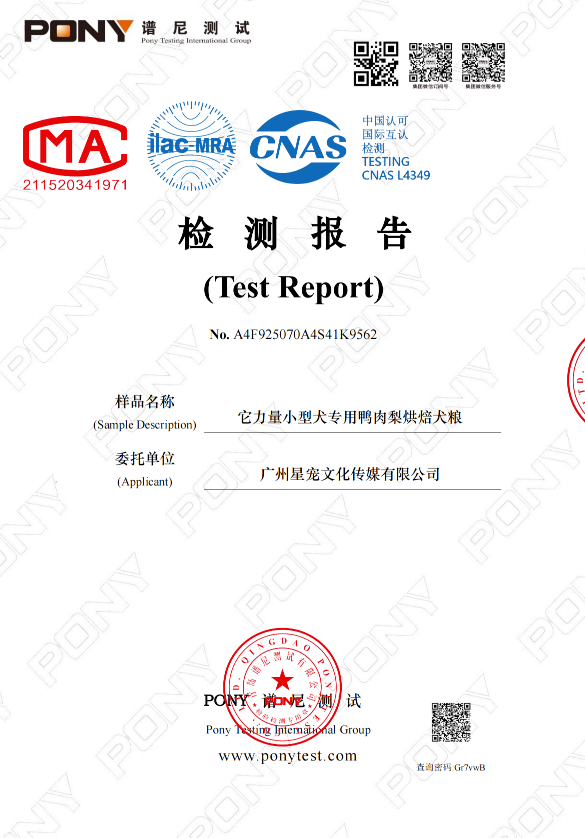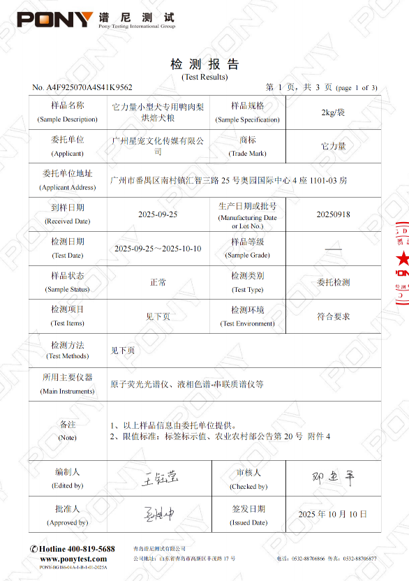 它力量小型犬专用鸭肉梨烘焙犬粮批次检测报告