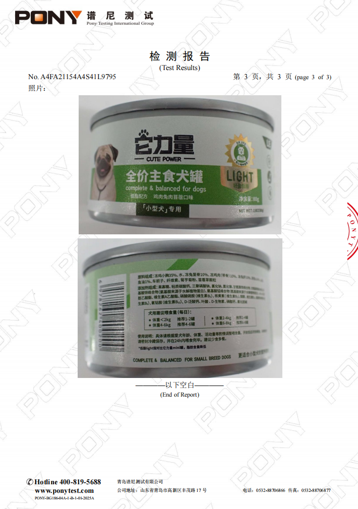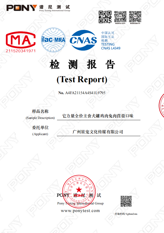 它力量VFS 全价主食犬罐 轻盈低脂 鸡肉兔肉苜蓿口味批次检测报告