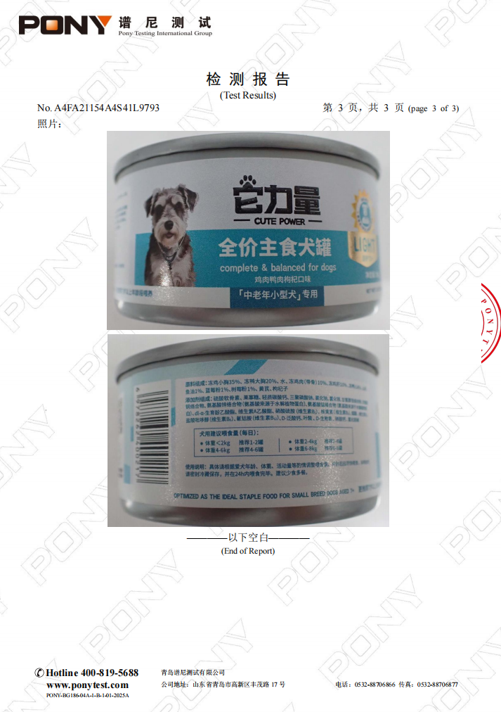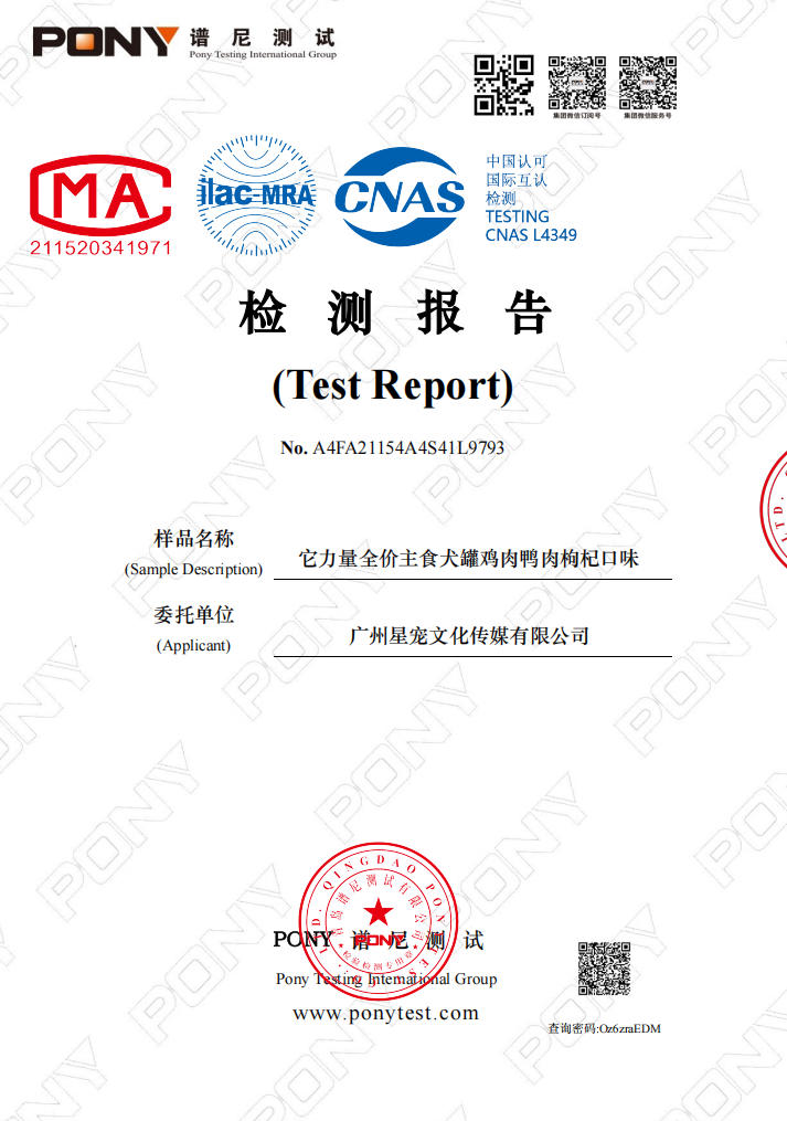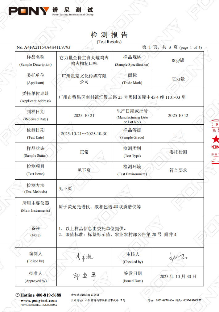 它力量VFS 全价主食犬罐 中老年小型犬专用 鸡肉鸭肉枸杞口味批次检测报告